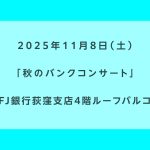 2025年11月9日(日)2025.10.17「天空からの響き」@荻窪タウンセブン屋上(屋外ステージ) 目次1 開催日2 会場3 概要4 出演・曲目4.1 地図 開催日 2025年11月9日(日) 会場 荻窪タウンセブン 屋上(屋外ステージ/上荻1-9-1) 概要 定員:80名 時間:開演14:00/終演15:00 入場料:無料 お問い合わせ:03-5347-0244(荻窪音楽祭事務局) 出演・曲目 【荻窪えんそうず】松本真由美(Sop Sax)、堀内節子(Alt Sax)、鈴木亜紀(Ten Sax)、後藤弘一(Bar Sax) J.バーンズ:アルバマー序曲、ほか 【horn orchestra とうきょう】根岸伊智郎、ほか J.シュトラウスⅡ:美しき青きドナウ、ほか 地図