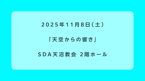 開催日 2025年11月8日(土) 会場 SDA天沼教会 2階ホール(天沼3-17-3) 概要 出演・曲目 地図